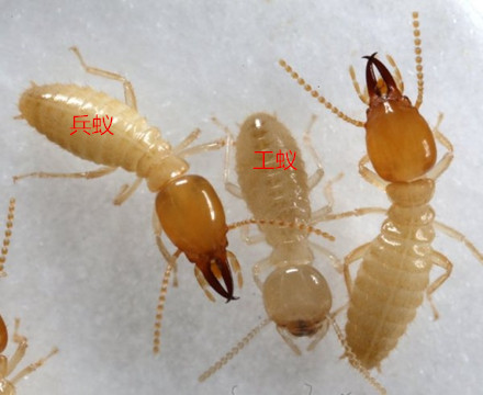 兵蟻是白蟻群體中變化較大的品級(jí),除少數(shù)種類缺兵蟻外,一般從3~4齡幼蟻開始,部分幼蟻分化為色澤較淡的前兵蟻,進(jìn)而成為兵蟻。